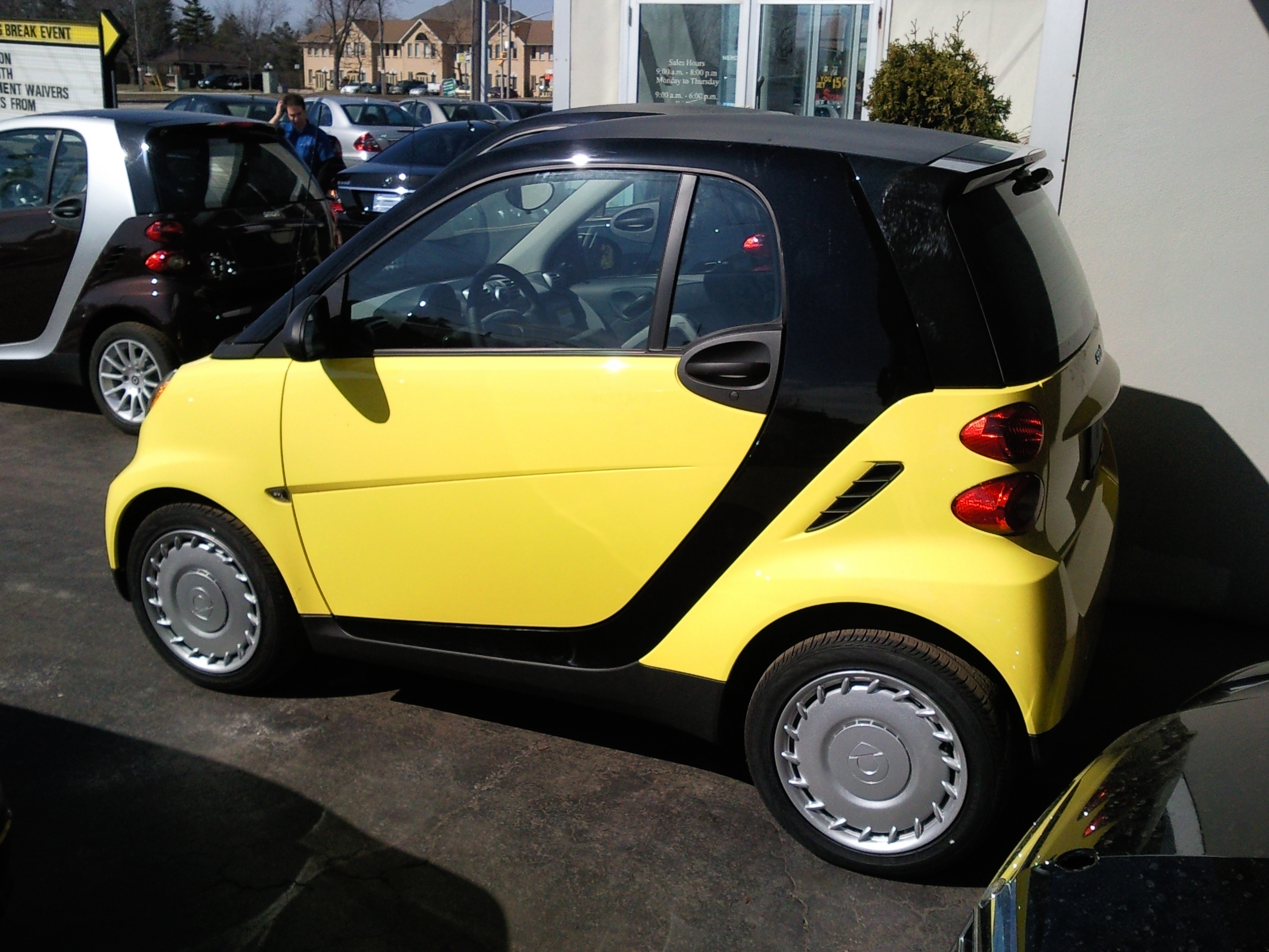 Above you can see my new 2010 “Smart for Two” smart-car, in a very bright shade of yellow. So if you’re in London Ontario Canada, and you see this little yellow beast drive by, that might be me.
