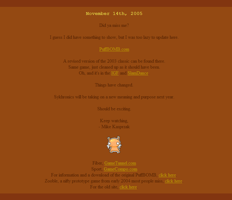 Sykhronics, pronounced “psi-cron-icks” [is] A branding of Mike Kasprzak’s independent game works. Established in 1998, replacing my older branding Gamma Flare Games. After bouncing around the gracious hosting of a few friends, I acquired the “dot com” in 2000. Sykhronics served my purposes as a portfolio site to nab me a job in the game industry, and did so in late 1999.